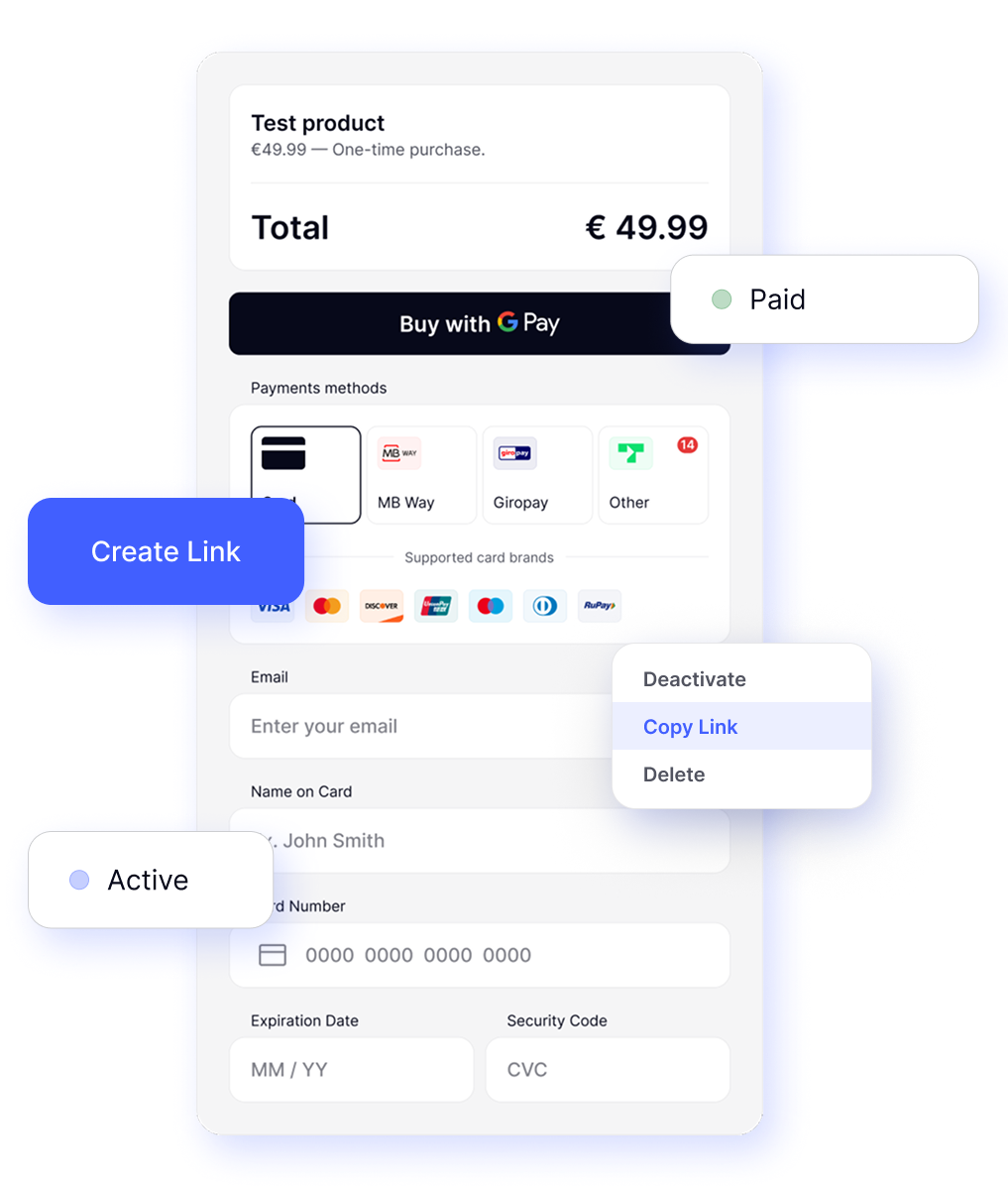The merchant can create customisable payment links via the back office so that their customers can make secure payments without integrating a payment page.